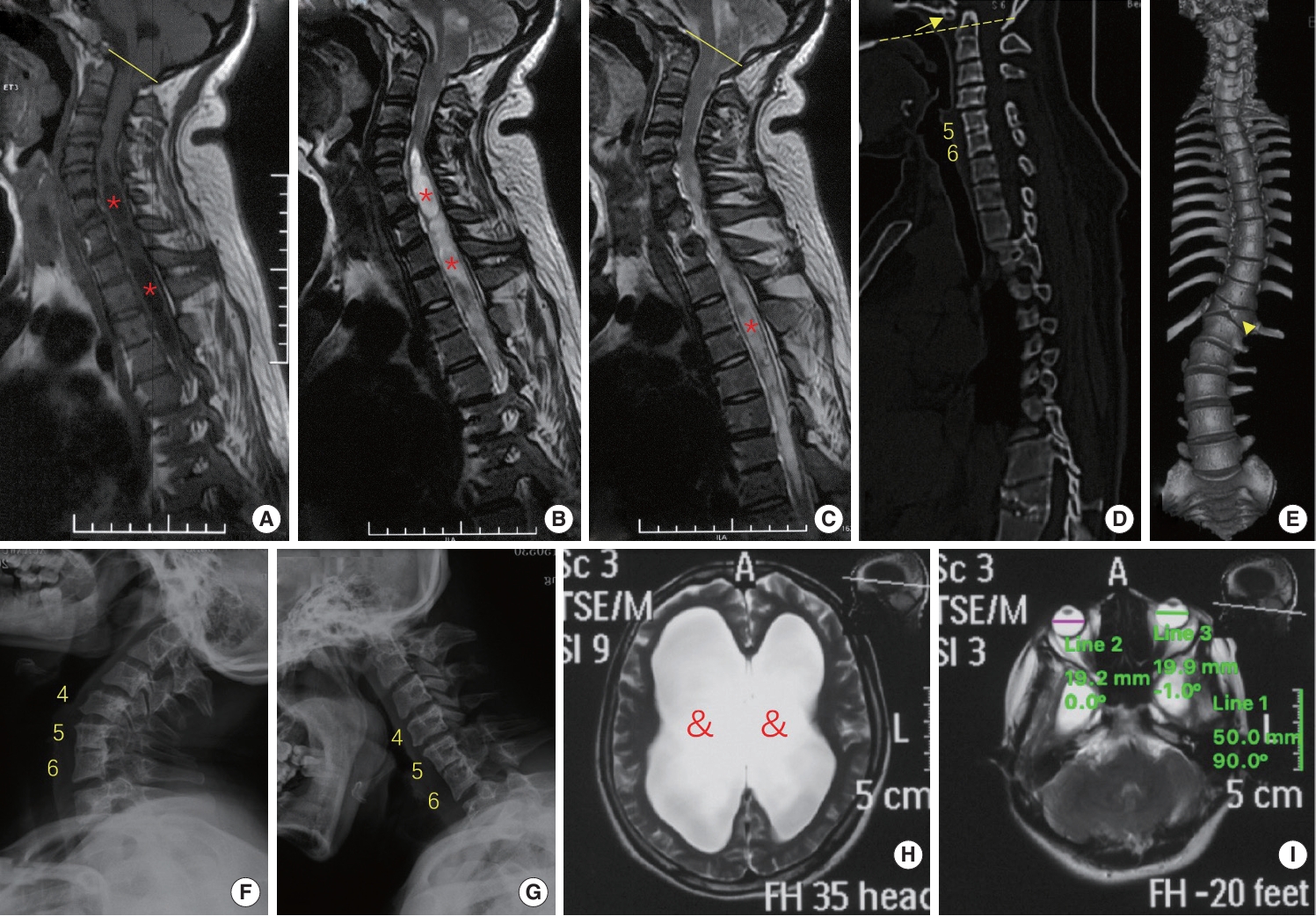 Fig. 5 phenotypes of the patient with a premature stop codon of BEST1 gene (p.S79Ffs*153). (A–C) Sagittal magnetic resonance imaging (MRI) revealed Chiari malformation (cerebellar tonsil exceeding the foramen magnum, yellow line) and extensive syringomyelia (red stars) at cervical and thoracic segments. (D–G) Computed tomography and x-ray showed assimilation of atlas (arrow), basilar invagination (odontoid process above the chamberlian line, yellow dotted line), Klippel-Feil malformation (fusion of C5 and C6 vertebrae), butterfly vertebra at T12 (arrow head) and scoliosis. (H, I) MRI of the head indicated hydrocephalus (&) and microphthalmia (diameter of eyeball is smaller than 20 mm).