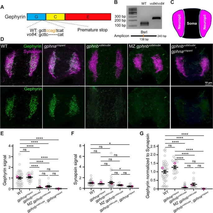 Fig. 1 Generation and validation of gphnbvo84 mutants. A Schematic of Gephyrin protein showing its three domains and the 5 bp deletion in gphnbvo84 causing a frameshift and premature stop. The BsrI recognition site used for genotyping was indicated in orange. B Representative gel images for genotyping gphnbvo84. A BsrI recognition site is disrupted by gphnbvo84 mutation in the middle of the amplicon. C Schematic of neuropil (magenta) and soma (black) regions in transverse spinal cord section of zebrafish at 5 dpf. D Representative transverse sections in the spinal cord at 5 dpf with Gephyrin (green) and Synapsin (magenta) staining from the following conditions: wildtype (WT); gphnacrispant, gphnbvo84/vo84; maternal zygotic (MZ) gphnbvo84/vo84; and gphnbvo84/vo84, gphnacrispant. E–G Gephyrin signal (E), Synapsin signal (F) and Gephyrin normalized to Synapsin (G) from the spinal sections. nWT = 19 fish, 41 sections, 3 technical replicates; ngphna = 12 fish, 20 sections, 1 technical replicate; ngphnb = 18 fish, 42 sections, 3 technical replicates; nMZ gphnb = 7 fish, 13 sections, 1 technical replicate; and n = 8 fish, 15 sections, 1 technical replicate. E, F[4, 126] = 45.29; F, F[4, 116] = 3.303; G, F[4, 129] = 56.29. All data are represented as mean ± SEM; ns, not significant; *, p < 0.05; ****, p < 0.0001; the data points corresponding to the representative images are noted in pink; ns, not significant; (E–G) one-way ANOVA with Tukey’s post-hoc test; scale bars 10 μm
