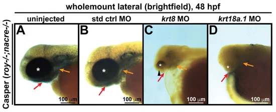 Fig. 3 Krt8/Krt18a.1 knockdown disrupts ocular and craniofacial development. Wholemount imaging showed that compared with their uninjected (A) and standard control (std ctrl) MO-injected (B) counterparts, krt8 MO-injected zebrafish embryos (C) developed microphthalmic eyes (asterisk) with coloboma (arrowhead), while krt18a.1 MO-injected embryos (D) had severely underdeveloped or anophthalmic eyes (asterisk) at 48 hpf, suggesting that the effects were more severe with Krt18a.1 knockdown. The absence of pharyngeal arch (orange arrows) and jaw (red arrows) formation was observed after MO knockdown in both cases.
