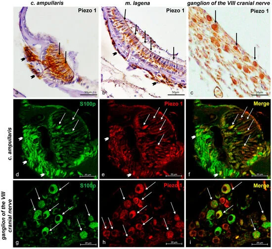 Fig. 4 Piezo 1 immunoreactivity in the inner ear of zebrafish (D. rerio). (a) The ciliate sensory cells (arrows) in the crista ampullaris and nerve (gallon arrows) that reach the crista ampullaris Piezo 1 immunoreactive; (b) the ciliate sensory cells (arrows) in the macula of the lagena and nerve (gallon arrows) that reach the macula of the lagena Piezo 1 immunopositive; (c) ganglion of the eighth cranial nerve Piezo 1 immunostained; (d) sensory ciliate cells (arrows) of the crista ampullaris and nerve (arrows per gallon) that reach the crista ampullaris s100p immunoreactive; (e) sensory ciliate cells (arrows) of the crista ampullaris and nerve (gallon arrows) reaching the crista ampullaris Piezo 1 immunopositive; (f) ciliate sensory cells (arrows) of the crista ampullaris and nerve reaching the crista ampullaris (gallon arrows) Piezo 1 and s100p double-labeled; (g) neuron (arrows) of ganglion of the eighth cranial nerve s100p immunostained and (h) Piezo 1 immunoreactive; (i) s100p/Piezo 1 double-labeled in some neurons of the eighth cranial nerve ganglion. Magnification 40×.
