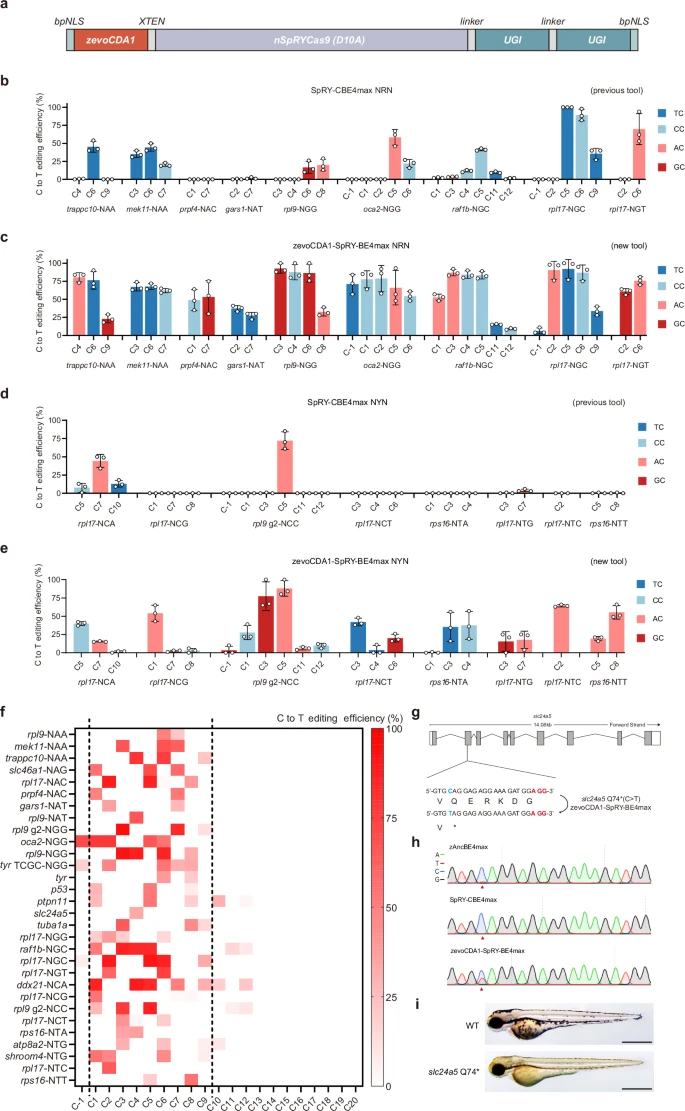 Fig. 2 Efficient cytosine base editing at non-canonical PAM sites by zevoCDA1-SpRY-BE4max.a Schematic representation of the mRNA construct for zevoCDA1-SpRY-BE4max. bpNLS: bipartite nuclear localization, zevoCDA1: cytosine deaminase, XTEN: a 32aa flexible linker, nSpRYCas9: SpCas9 nickase varient, linker: SGGSSGGS amino acid, UGI: Uracil glycosylase inhibitor. b–e Comparison of editing efficiencies between SpRY-CBE4max (b, d) and zevoCDA1-SpRY-BE4max (c, e) using 17 gRNAs targeting NRN PAMs (b, c) and NYN PAMs (d, e). The data represent the aggregate results of three independently replicated experiments, and the error bars indicate the standard deviation of the mean values. f Editing efficiency of zevoCDA1-SpRY-BE4max at 30 NNN PAM sites across 18 genes. g Schematic diagram of the slc24a5 target locus. The targeted sequence is shown with the PAM highlighted in red. The targeted cytosine nucleotide and expected changes are highlighted in blue. h Sanger sequencing results comparing zAncBE4mx, SpRY-CBE4max and zevoCDA1-SpRY-BE4max at the slc24a5 Q74* target locus. The red arrowhead indicates the expected nucleotide substitutions. i Lateral view of 3 dpf F1 homozygous embryos with the slc24a5 Q74* mutation (bottom) showing pigmentation defects compared with wild-type (top). Scale bar: 500 μm. Three independent experiments were repeated with similar results. Source data are provided as a Source Data file.