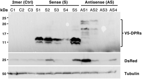 Fig. 2 Western blot of RAN-translated products in transgenic 2mer (Ctrl), sense (S), and antisense (AS) 5 days postfertilization embryonic zebrafish. Three 2mer (Ctrl), 5 sense (S), and 4 antisense (AS) generated transgenic lines were probed with anti-V5, anti-DsRed and anti-tubulin (loading control) antibodies. RAN = repeat-associated non-AUG.