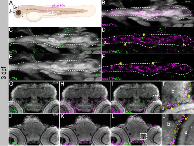 nf2a/b is expressed in Schwann cells and meninges. (A) Schematic representing the posterior lateral line Schwann cells (pLLn SCs; white dashed line box) and sectioned regions (black dashed lines) at 3 dpf. (B-F) Multiplexed fluorescent mRNA in situ hybridizations by HCR on whole-mount embryos reveal expression of nf2b, nf2a and sox10 in a Schwann cell cluster at 3 dpf. Yellow arrows indicate cells that have both sox10 and nf2 expression. White dashed lines indicate pLLn SCs expressing sox10. (G-I,J-L) Multiplexed fluorescent mRNA in situ hybridizations by HCR on cryo-sectioned embryos reveal expression of nf2b, nf2a and foxc1b in the cranial meninges at 3 dpf. (I′,L′) Magnified images of the regions in the white dashed line boxes in I and L, respectively. Yellow dashed lines mark the meninges layer in close proximity to the brain; yellow arrowheads indicate cells that have both foxc1b and nf2 expression. Images are representative of n=7 embryos. Images in B-F represent confocal planes of 5 μm thickness. G-L are histological sections of 12 μm thickness imaged with Apotome. DAPI (gray) was used as a counterstain. b, brain; e, eye.