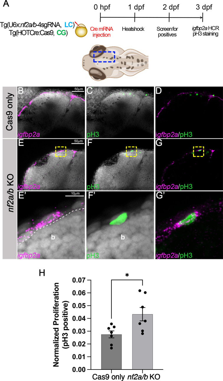 nf2a/b knockout leads to increased meningeal proliferation. (A) Schematic representing the experimental strategy. Blue dashed line box in the 3 dpf zebrafish schematic indicates the imaged region. (B-G) Confocal images of the cranial region of 3 dpf Cas9-only (B-D) and nf2a/b knockout (E,F,G) embryos show the overlap of meningeal marker igfbp2a and proliferation marker pH3. (E′,F′,G′) Yellow dashed line boxes show the magnified region of the overlap in the nf2a/b knockout embryos. (H) Bar plot showing quantification of normalized proliferation (*P=0.0197; each dot represents data from one larva). Normalized proliferation=Igfbp2a and pH3 double-positive cells/total pH3-positive cells in the analyzed region. Each dataset was compared using unpaired two-tailed Student's t-test in GraphPad Prism. Error bars indicate s.e.m. across n=7 embryos. White dashed line marks the boundary between the brain and meninges. Images in B-E, F and G represent maximum-intensity projections of confocal planes in whole-mount embryos. E′, F′ and G′ represent confocal planes of 3.2 μm thickness. DAPI (gray) was used as a counterstain. b, brain; KO, knockout; pH3, phospho-histone 3.