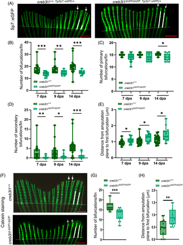 Fig. 7 creb3l1 mutant zebrafish exhibit bifurcation defects during regeneration of the caudal fin. (A) Approximately 50% of the caudal fin was amputated from 6 mpf creb3l1+/+,Tg(Sp7:eGFP)/+ and creb3l1ΔbZIP/ΔbZIP,Tg(Sp7:eGFP)/+ fish. At different dpa, the tails were imaged directly by fluorescence. Representative images of 7 dpa regenerates are shown. Amputation planes are marked with dashed white lines. The distance between the amputation plane and the primary bifurcation point in the second and third ray is marked with white lines. In wild-type fish, secondary bifurcations are indicated by white arrows. In mutant fish, lack of secondary bifurcation is marked with gray arrows. Scale bar = 1 mm. (B) Images analogous to those in (A) were used to quantitate the number of total bifurcations in a 7, 9, and 14 dpa fin regenerate. Each data point represents an individual fish. n = 10–18. **p ≤ .01; ***p ≤ .001. (C) Images analogous to those in (A) were used to quantitate the number of primary bifurcations in a 7, 9, and 14 dpa fin regenerate. Each data point represents an individual fish. n = 10–18. *p ≤ .05. (D) Images analogous to those in (A) were used to quantitate the number of secondary bifurcations in a 7, 9, and 14 dpa fin regenerate. Each data point represents an individual fish. n = 10–18. *p ≤ .05; **p ≤ .01; ***p ≤ .001. (E) Images analogous to those in (A) were used to quantitate the distance from the amputation plane to first bifurcation in the second and third ray in the regenerate. Each data point represents an individual fish. Significant increase in distance is observed in creb3l1ΔbZIP/ΔbZIP,Tg(Sp7:eGFP)/+ fish at all dpa. n = 12–20. *p ≤ .05. (F) Approximately 50% of the caudal fin was amputated from 6 mpf creb3l1+/+ and creb3l1ΔbZIP/ΔbZIP fish. At 9 dpa, the tails were stained with calcein fluorophore and imaged by fluorescence. Representative images of regenerates are shown. Amputation planes are indicated with dashed white lines. The distance between the amputation plane and the primary bifurcation point in the second and third ray is marked with white lines. In wild-type fish, secondary bifurcations are indicated by white arrowheads. In mutant fish, lack of secondary bifurcation is marked with gray arrows. Scale bar = 1 mm. (G) Images analogous to those in F were used to quantitate the total number of bifurcations in the regenerating fin. Each data point represents an individual fish. n = 14. ***p ≤ .001. (H) Images analogous to those in F were used quantitate the distance from the amputation plane to first bifurcation in the second and third ray in the regenerate. Significant increase in distance is observed in creb3l1ΔbZIP/ΔbZIP mutant fish. n = 14. **p ≤ .01.