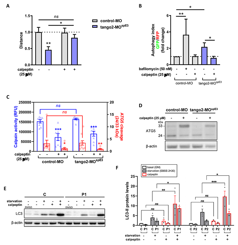 Figure 3 Calpeptin ameliorates TANGO2 disease features in zebrafish and in primary myoblasts.