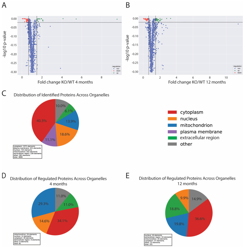 Changes in the muscle proteomes of early and late adults. Figure shows volcano plots of the distribution changes in 4-month-old (