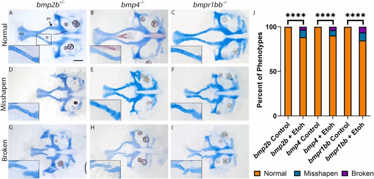 Fig. 1 Multiple members of the Bmp pathway exhibit ethanol-induced palate defects. (A-I) Flat-mount images of neurocranium of 5 dpf larva. Cartilage is blue and bone is red (anterior to the left, scale bar: 100 μm, ep = ethmoid plate, tr = trabeculae and pc = polar cartilage, large images were captured at 10x, inset is 20x image of the left trabecula). (J) total percentage of palate phenotype in ethanol-treated Bmp mutants and controls. (A-C) heterozygous bmp2b or homozygous bmp4 or bmpr1bb mutant larva develop normal neurocranium. Insets show normal stacking of cells in the trabecula. (D-I) Exposure of 1 % ethanol results in a range of defects to palate, from misshapen trabecula (D-F) to breaks in the trabeculae at the polar cartilages (G-I). Percent of phenotypes were quantified and compared for untreated and ethanol-treated larvae for each Bmp component using Fisher’s Exact Test (**** = p <0.0001) (J). “n” for each Bmp component listed in Table 1.