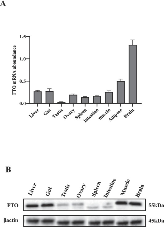 Fig. 5 Tissue distribution of FTO. (A) FTO mRNA abundance in different tissues. (B) Western blot analysis of FTO protein in different tissues. The amount of FTO mRNA abundance was normalized to the amount of β-actin. Bars present the mean ± SEM (n = 6 zebrafish).