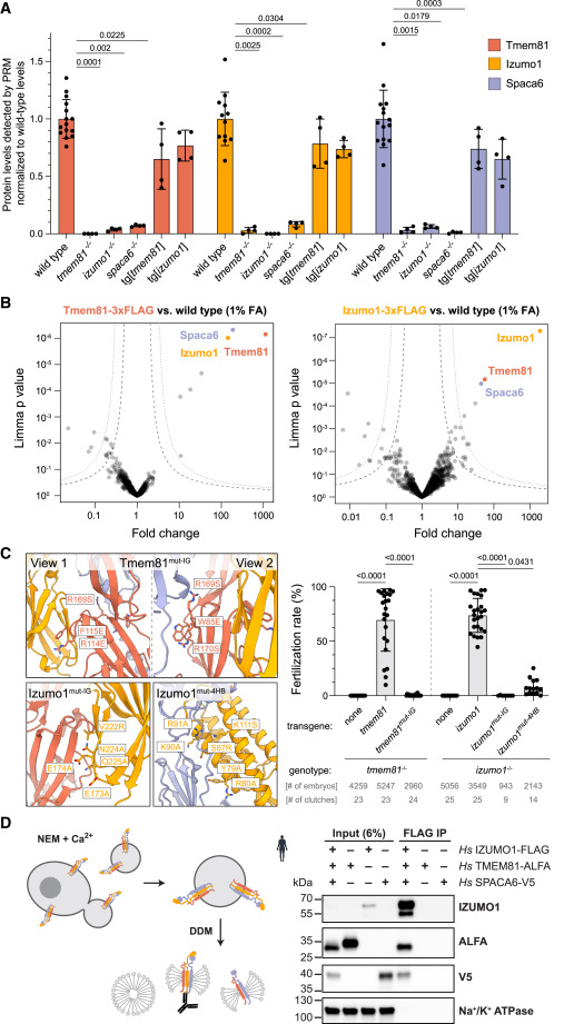 Fig. 3 Human and zebrafish IZUMO1, SPACA6, and TMEM81 interact (A) Relative protein levels in wild-type and mutant zebrafish sperm by PRM-MS42 normalized to 6 constant proteins. (B) Volcano plots of differentially enriched proteins in FLAG coIPs from gently fixed sperm expressing Tmem81-3xFLAG-sfGFP (left) or Izumo1-3xFLAG-sfGFP (right) versus wild-type sperm. Trimer members are highlighted. False discovery rate (FDR) thresholds43 indicated as dotted (1% FDR) and dashed lines (5% FDR). (C) Complex formation between Izumo1, Spaca6, and Tmem81 is required for male fertility in zebrafish. Left: zoomed-in views of the predicted interfaces between zebrafish Izumo1 (yellow), Spaca6 (blue), and Tmem81 (red) with mutated amino acids shown as sticks as modeled by AlphaFold-Multimer. Right: fertilization rates in zebrafish of transgenic males in the respective mutant background with wild-type females. Fertilization rates for tmem81−/−, tg[tmem81], izumo1−/−, and tg[izumo1] replotted from Figure 2A. (D) Human orthologs interact in vitro. Freestyle 293-F cells were transfected to co-express full-length human sperm trimer proteins and induced to shed giant plasma membrane vesicles (GPMVs)44 with N-ethylmaleimide (NEM) and Ca2+. n-Dodecyl-β-D-maltoside (DDM)-solubilized GPMVs were used for coIP. Western blot of FLAG coIP after co-expression of Hs IZUMO1-3xFLAG, Hs SPACA6-3xV5, and Hs TMEM81-ALFA or the individual proteins. The plasma membrane protein Na+/K+ ATPase controls for non-specific capture of membrane fragments. Bar graphs represent mean ± SD. Significant p values calculated by Kruskal-Wallis test with Dunn’s multiple comparisons test. All other comparisons are non-significant. See also Figure S4.