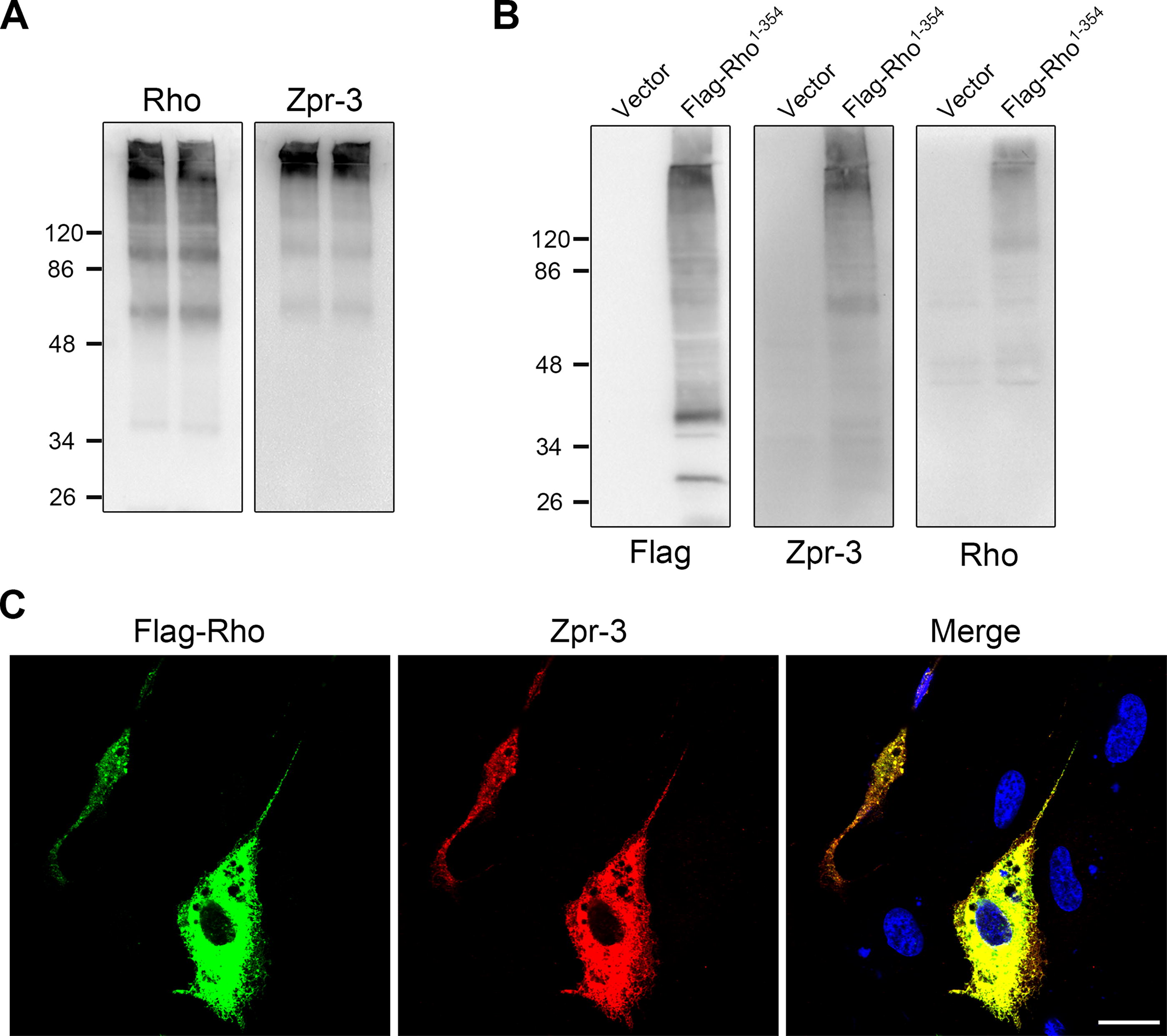 Fig. 1 The antigen of zpr-3 is zebrafish Rho protein. (A) The ladder-like bands produced by zpr-3 and the anti-Rho antibody in the western blot assays of wild-type zebrafish protein lysates. (B) Full-length zebrafish Rho protein tagged with Flag was expressed in ARPE-19 cells and detected by western blot using the zpr-3, anti-Rho and anti-Flag antibodies, respectively. The images of western blot are shown. (C) Overlapping of the fluorescence signals of zpr-3 and anti-Flag antibodies in ARPE-19 cells transfected with the zebrafish rho expression plasmid. Scale bar, 20 μm.