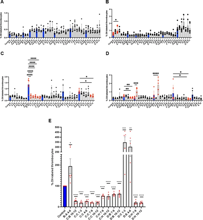 Fig. 1 Quantification of DiI-labeled young and mature thrombocytes from flow cytometric data in whole blood after knockdown (KD) of sets of three genes in zebrafish. 394 protein-encoded genes uniquely expressed in RFP + young thrombocytes in adult zebrafish were screened as 132 sets, and DiI-labeled thrombocyte percentage was estimated (A) from set 1 to set 32 (B) from set 33 to set 64 (C) from set 65 to set 96 (D) from set 97 to set 132. (E) the positives from A-D are replotted for easy visualization using a single wild-type (WT) control represented by a blue bar, while all KDs are shown as grey bars to the right of the WT control. Since A-D positives had daily controls, each control value was taken as 100% and the experimental values were normalized to these control percentages and plotted. 4 to 6 fish were utilized for each KD set and controls (N = 4–6). The lines above the bars indicate a significant difference between WT and KD sample sets. One-way ANOVA was used for statistical analysis. Error bars represent mean ± SD. *, **, ***, and **** represent p ≤ 0.05, p ≤ 0.01, p ≤ 0.001, and ≤ 0.0001, respectively. A p-value < 0.05 was considered significant.