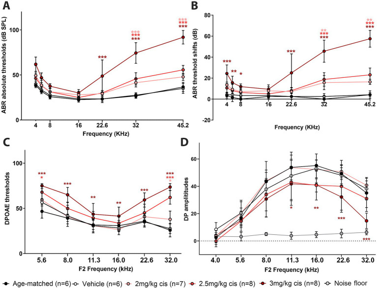 Clinical cisplatin affects hearing function in mice in a dose-dependent manner. Eight weeks old mice (>20 grams) received clinical cisplatin in a multi-cycle protocol. Hearing function was measured before and after the completion of cisplatin treatment. The following groups were tested: age-matched controls (black circles), vehicle (saline solution, white circles), clinical cisplatin at 2 mg/kg b.w. (pink circles), 2.5 mg/kg b.w (red circles) and 3 mg/kg b.w. (marron circles).
