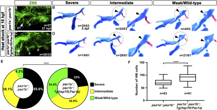 Rescue of the defects in the first pouch and hyomandibular cartilage in pax1 double mutants with an enforced expression of pax1a at 16 hpf. (A, C) Zn5 staining labels to visualize pouches at 37 hpf. The first pouches are marked with arrowheads. After the heat-shock treatment at 16 hpf for 40 min, while only two pouches (p1 and p) with abnormal shapes are seen in pax1 double mutants (A), the first pouch (p1) is pretty normal, with other pouches disorganized, in pax1 double mutants carrying Tg(hsp70I:Pax1a) transgene (C). p, pouch. Scale bar = 40 μM. (B, D) Unilateral dissections of the skeletons of the mandibular and hyoid arches stained with Alcian Blue (cartilage) and Alizarin Red (bone) at 5 dpf, along with inserts showing the zoomed-in HM plate (circled areas). (B) After the heat shock treatment in pax1 double mutants, a rod-shape HM is seen in the severe group, more cells appear in the rod-shape HM in the intermediate group compared to the severe group, and the foramen is seen, with adjacent mono-layered cells in the weak group. Arrowheads indicate the cells appearing in the HM plate in the intermediate group and the mono-layered cells adjacent to the foramen in the weak group. No wild-type HM plate is observed. (D) After the heat shock treatment in pax1 double mutants bearing Tg(hsp70I:Pax1a) transgene, HM defects in all three groups were observed, but with a different frequency than those observed in (B); wild-type HM plates are also observed. Arrowheads indicate the cells appearing in the HM plate in the intermediate group and the multi-layered cells adjacent to the foramen in the wild-type HM plate. (E) Quantification of the frequency of each group between (B, D). The frequency of each group is counted. Data is represented on a pie chart. Black, yellow, and green represent the severe, intermediate, and weak/wild-type groups, respectively. **** indicates p < 0.0001. (F) Quantification of HM defects. The number of cells in HM is counted. Data is represented on a boxplot. **** indicates p < 0.0001. n, number of animals analyzed.