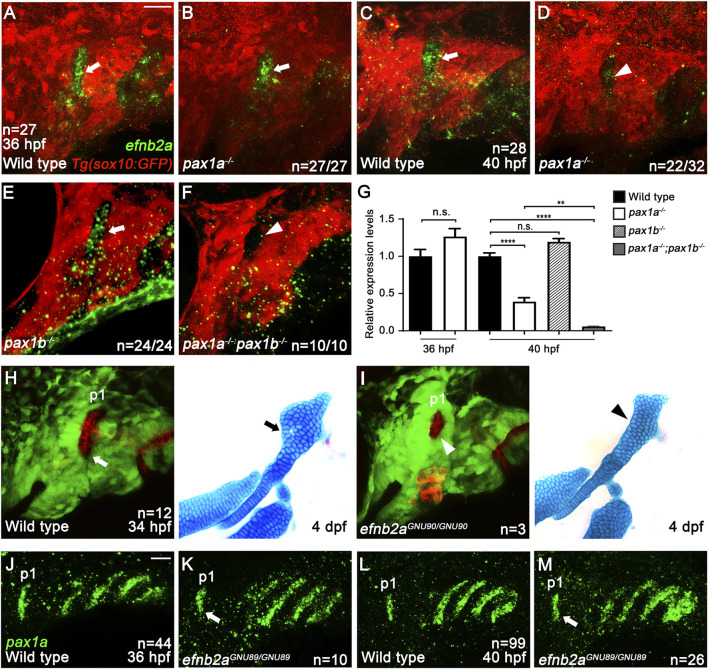 Genetic linkage of EphrinB2a with Pax1a in hyomandibular plate development. (A–F)In situ hybridization of efnb2a (green) in conjunction with the GFP immunohistochemistry (red). In wild types bearing Tg(sox10:GFP) transgene, efnb2a expression in the first pouch at 36 (A) and 40 hpf (C) is seen (arrows). In the first pouch of pax1a mutants, efnb2a expression at 36 hpf is unaffected [arrow in (B)] but is reduced at 40 hpf in 22 out of 32 animals [arrowhead in (D)]. In the first pouch of pax1b mutants, efnb2a expression at 40 hpf is unaffected [arrow in (E)]. In pax1a and pax1b double mutants, efnb2a expression in the first pouch at 40 hpf is abolished [arrowhead in (F)]. Scale bar = 20 μM. Anterior is to the left. (G) Relative expression levels of efnb2a mRNAs in wild types and pax1 mutants. Expression in wild types set at 1. Transcripts of efnb2a are downregulated in pax1a mutants at 40 hpf but not at 36 hpf. Expression of efnb2a mRNAs is further reduced in pax1a and pax1b double mutants at 40 hpf compared to pax1a mutants. Transcripts of efnb2a are barely affected in pax1b mutants at 40 hpf compared to wild types. ** and **** show p < 0.01 and p < 0.0001, respectively. n.s., not significant. (H, I) Confocal projections from live imaging of embryos bearing Tg(her5:mCherryCAAX) (red) and Tg(sox10:GFP) (green) transgenes at 34 hpf, followed by Alcian Blue staining (blue) in the same individuals at 4 dpf. In a wild-type individual, a bilayered normal first pouch is seen at 34 hpf [white arrow in (H)], with the triangular HM plate observed at 4 dpf [black arrow in (H)]. In an efnb2a mutant individual, the first pouch was hypoplastic at 34 hpf [white arrowhead in (I)], with the HM plate defective at 4 dpf [black arrowhead in (I)]. (J–M)In situ hybridization for pax1a (green). Compared to wild types, pax1a expression in the first pouch was unaffected in efnb2a mutants at 36 and 40 hpf [arrows in (K, M)]. Scale bar = 20 μM. Anterior is to the left. n, number of animals analyzed.