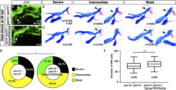Requirement of Pax1a-EphrinB2a after pouch formation in hyomandibular plate development. (A, C) Zn5 immunohistochemistry to visualize pouches at 40 hpf. Arrowheads mark the first pouch (p1). After the heat-shock treatment at 39 hpf for 40 min, the first pouch is hypoplastic in pax1 double mutants carrying Tg(hsp70I:EfnB2a) transgene, which is similar to the hypoplasia first pouch in pax1 double mutants. Scale bar = 40 μM. (B, D) Lateral views of dissected facial skeletal elements of the mandibular and hyoid arches and inserts showing the zoomed-in HM plate (circled areas). After the heat shock treatment, the severe, intermediate, and weak defects in HM are seen in both pax1 double mutants and those bearing Tg(hsp70I:EfnB2a) transgene. No wild-type HM plate is observed in (B, D). Arrowheads indicate cells appearing in the HM plate in the intermediate group and the mono-layered cells adjacent to the foramen in the weak group. (E) Quantification of the frequency of each group between (B, D). The frequency of each group is counted. Data is represented on a pie chart. Black, yellow, and green represent the severe, intermediate, and weak groups. * indicates p < 0.05. (F) Quantification of HM defects. The number of cells in HM is counted. Data is represented on a boxplot. *** indicates p < 0.001. n, number of animals analyzed.