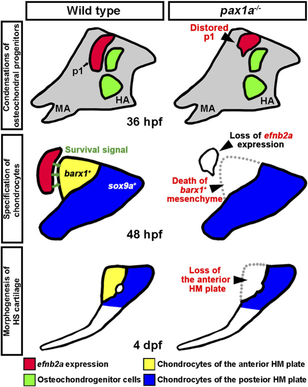 A model for the role of Pax1a in hyomandibular plate development. In wild types, Pax1a is necessary for the morphogenesis of the first pouch that forms at 18 hpf, with the loss of Pax1a leading to a distorted first pouch. After pouch formation,