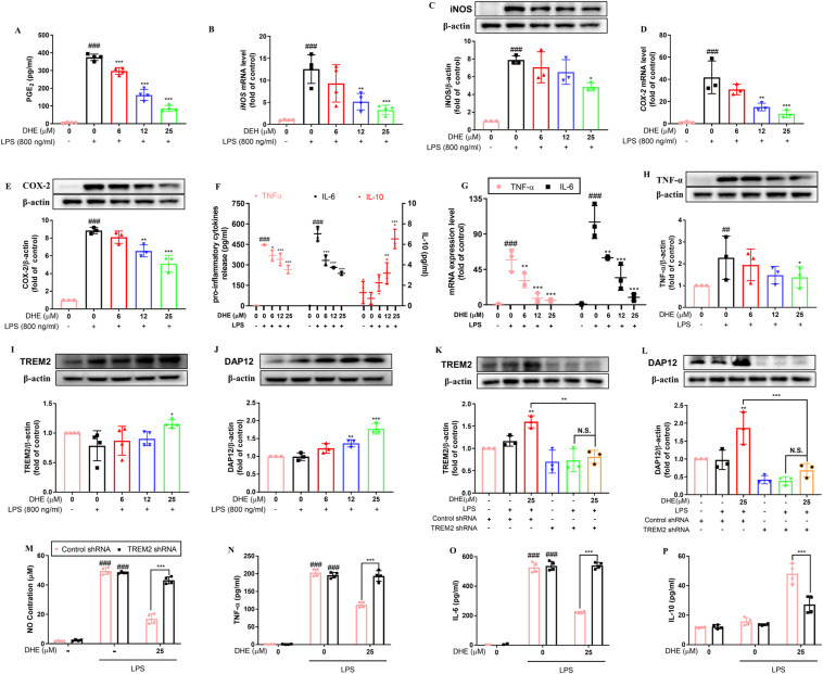 Fig. 2 DHE suppressed LPS-induced activation of proinflammatory mediators and prevented the release of inflammatory cytokines by targeting TREM2. Cells were pretreated with DHE for 1 h and then exposed to LPS for another 24 h. (A) PGE2 production was determined by ELISA; n = 4. (B, D) The mRNA levels of iNOS and COX-2 were detected by RT-PCR analysis; n = 3. (C, E) Protein levels of iNOS and COX-2 were measured by Western blot analysis; n = 3. (F) Secretion levels of TNF-α, IL-6, and IL-10 in the cell culture medium were determined by relative ELISA; n = 4. (G) The mRNA levels of TNF-α and IL-6 were assessed by RT-PCR analysis; n = 3. (H) Protein levels of TNF-α were evaluated by Western blot analysis; n = 3. TREM2 (I) and DAP 12 (J) protein expression were detected by Western blot analysis and quantified by ImageJ. After TREM2 was knocked down using shRNA, microglial cells were treated with DHE in the presence or absence of LPS to determine TREM2 (K) and DAP12 (L) protein expression levels. The supernatant of BV2 cells was then used to measure NO production (M), TNF-α (N), IL-6 (O), and IL-10 (P) via Griess reagent and ELISA assay, respectively; n = 3–4. Data are presented as the mean ± SD analyzed by one-way ANOVA. ∗p < 0.05, ∗∗p < 0.01, and ∗∗∗p < 0.001 vs. the LPS-treated group; #p < 0.05, ##p < 0.01, and ###p < 0.001 vs. the control group; N.S. = not significant.
