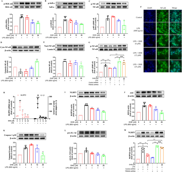 Fig. 3 DHE inhibited the activation of NF-κB signaling and the NLRP3 inflammasome in LPS-treated BV2 microglial cells via TREM2 activation. Cells were pretreated with DHE for 1 h and then exposed to LPS for another 24 h. (A–D) The levels of total/phosphorylated IKKα/β (A), IκB α (B), and P65 (C) were measured by Western blot. (D–E) The expression levels of total NF-κB p65 in the cytoplasmic fraction (D) and nuclear fraction (E) were quantified by Western blot. (F) The nuclear translocation of p65 was evaluated by immunofluorescence analysis. Cells were stained with anti-p65 antibody (green) and DAPI (blue). (G) Cells were transfected with negative control shRNA or TREM2 shRNA, and then the NF-κB p65 expression level in BV2 cells after treatment with DHE or LPS was assessed by Western blot analysis. (H) The mRNA levels of NLRP3 and IL-1β were detected by RT-PCR analysis. (I–L) Protein levels of NLRP3 (I), ASC (J), cleaved caspase-1 (K), and pro-IL-1β (L) were measured by Western blot analysis. (M) Cells were transfected with TREM2 shRNA or a negative control shRNA, and after being treated with DHE or LPS, the level of NLRP3 expression in BV2 cells was determined by Western blot analysis (∗∗p < 0.01 and ∗∗∗p < 0.001 by the one-way ANOVA). Data are presented as the mean ± SD analyzed by one-way ANOVA. ∗p < 0.05, ∗∗p < 0.01, and ∗∗∗p < 0.001 vs. the LPS-treated group; #p < 0.05, ##p < 0.01, and ###p < 0.001 vs. the control group; N.S. = not significant; n = 3.