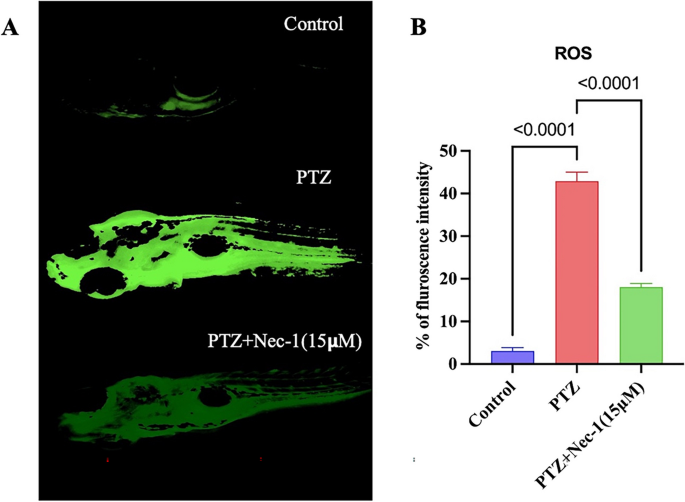 Fig. 3 Nec-1 mitigates ROS production in PTZ-induced epileptic zebrafish larvae. A The ROS levels were measured by image analysis and fluorescence microscope. B Individual zebrafish fluorescence intensity was quantified using an ImageJ program. Evaluation of ROS levels using DCFH-DA fluorescent probe in zebrafish larvae at 7 dpf. Exposure to PTZ resulted in a significant elevation in ROS levels, whereas prior administration of Nec-1 (15 µM) effectively mitigated ROS generation. The images were acquired with an inverted fluorescent microscope (Optika IM3, Italy) with a magnification of × 10. Results are expressed as mean ± SD, each performed in triplicate (n = 15). Data were analyzed by one-way ANOVA, followed by Tukey’s post hoc test