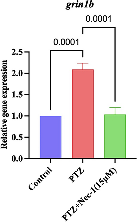Fig. 6 Effect of selective RIPK1 inhibitor (Nec-1) on GRIN1B expression in PTZ-stimulated epileptic zebrafish larvae (n = 50). The figure represents the suppressive effect of Nec-1 on GRIN1B gene expression in zebrafish larvae subjected to PTZ. Results are expressed as mean ± SD, each performed in triplicate. Data were analyzed by one-way ANOVA, followed by Tukey’s post hoc test