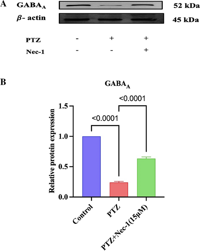 Fig. 7 Quantification of GABAA receptor expression normalized to beta-actin. A Western blot analysis of GABAA B QuantitativeanalysesofGABAA. The figure illustrates the significant elevation in GABAA receptor expression in zebrafish larvae (n = 50) pretreated with Nec-1, indicating its potential as an anticonvulsant through modulation of TNFα/TNFR1 signaling. Results are expressed as mean ± SD, each performed in triplicate. Data were analyzed by one-way ANOVA, followed by Tukey’s post hoc test