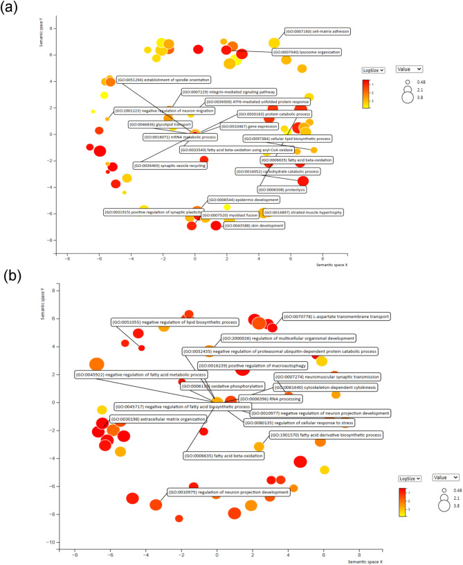 Fig. 5 (a) Scatterplot showing the most significant GO terms emerging from proteomic analysis at 10 dpf in the zebrafish Tg(gfap:hGFAP(R239C)-GFP) larvae compared to Tg(gfap:GFP)mi2001 controls. (b) Scatterplot showing the most significant GO terms emerging from proteomic analysis of 20-dpf Tg(gfap:hGFAP(R239C)-GFP) and Tg(gfap:GFP)mi2001 larvae. Analysis was performed with Revigo, which uses Multidimensional Scaling (MDS) to reduce the dimensionality of a matrix of the GO terms pairwise semantic similarities. The resulting projection may be highly nonlinear. Connected similar GO terms remain close together in the plot; the semantic space units have no intrinsic meaning. Bubble color indicates the p-value for the false discovery rates; circle size indicates the frequency of the GO term in the underlying GO database, where bubbles of more general terms are larger.