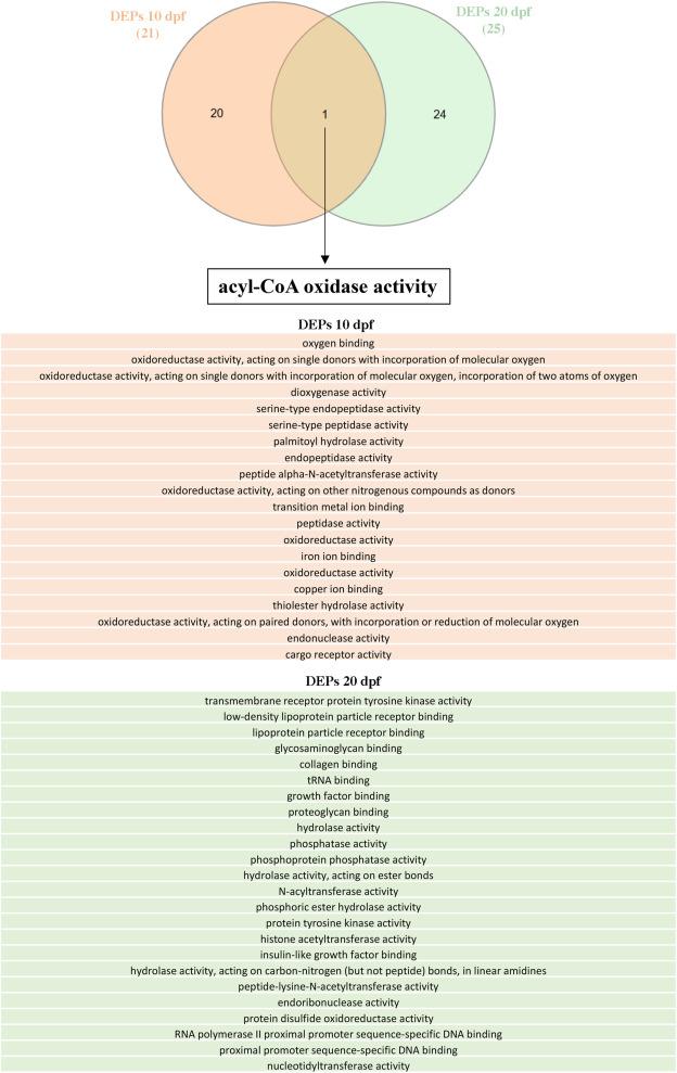 Fig. 6 Venn diagram, obtained with PANGEA, illustrating the biological processes emerging from proteomics analysis at 10 and 20 dpf in the mutant Tg(gfap:hGFAP(R239C)-GFP) compared to the control.