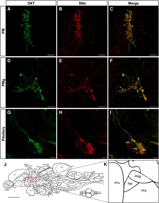 Fig. 2 Immunocytochemical localization of Oxt-ir and Scg2a/SNa-ir in female zebrafish. Microscopy imaging of Oxt-ir (green) and Scg2a/SNa-ir (red) preoptic magnocellular (PM; A–C) and gigantocellular (PMg; D–F) regions, and pituitary (G–I). Merged images show colocalization (yellow-orange) of both immunoreactivities in these paraffin sections. RPD, rostral pars distalis; PPD, proximal pars distalis; NIL, neurointermediate lobe. A–F) 20× magnification; G–I) 10× magnification. The position of the PM and PMg relative to the zebrafish forebrain (J), and the PPa and PPa (anterior and posterior parts of parvocellular preoptic nucleus) are shown for reference. Scale bars in A–I = 50 µm. Scale bar in J = 500 µm