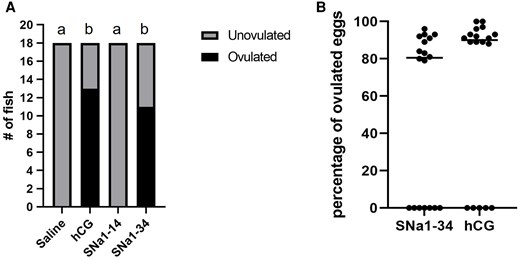 Fig. 6 Ovulation of female zebrafish 6 h, following i.p. injection with saline, SNa1–14, SNa1–34, and hCG. A) The number of ovulating females was compared using Fisher’s exact test. Different letters (a, b) above the bars indicate a significant difference (P < 0.01) in the number of ovulated females. B) The percentage of ovulated eggs in female zebrafish injected with SNa1–34 or hCG. Individual levels are depicted along with median values (horizontal line; n = 18); Mann–Whitney U test; P > 0.05. Note that females that did not ovulate are depicted as black dots along the 0 point of the x axis.