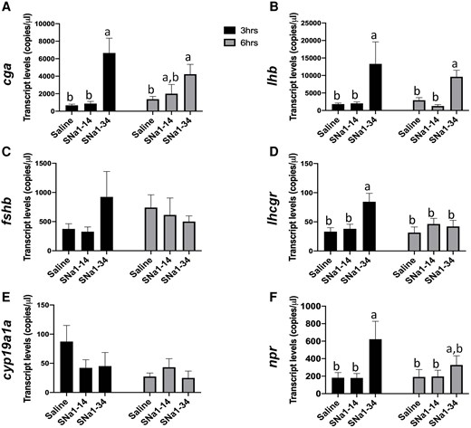 Fig. 8 Effects of SNa1–14 and SNa1–34 injection on reproduction-related gene expressions in pituitary (A–C) and ovary (D–F) in female zebrafish. Transcript levels of cga (A), lhb (B), and fshb (C) in pituitary and levels of lhcgr (D), cyp19a1a (E), and npr (F) in ovary are presented (mean + SEM; n = 8). Means with different letters (a, b) indicate a significant difference (two-way ANOVA; P < 0.05).