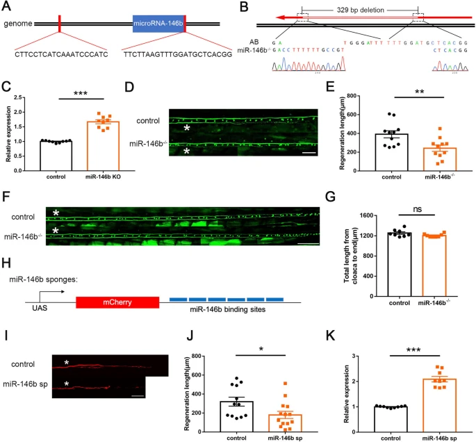 Fig. 3 miR-146b loss-of-function inhibits M-cell axon regeneration by upregulating snphb. A Schematic of sgRNA target sites on both sides of microRNA-146b. B Sequencing results showed a ~329 bp deletion containing microRNA-146b in the miR-146b-/- mutants. C Quantitative RT-PCR assays showed a significant increase in snphb expression in the brains of 5-month-old adult miR-146b-/- mutants. D, E Representative images of control (T056) and miR-146b-/- M-cell axon regeneration results. Statistical results showed that miR-146b deletion inhibits axon regeneration in zebrafish M-cells. White asterisk denotes the injury site. Control: 390.9 ± 38.05 μm; miR-146b-/-: 242.1 ± 33.37 μm. Scale bar, 50 μm, ** P < 0.01, error bars indicate SEM. F, G No significant difference in the length of axons from the cloaca to the end between control (T056) and miR-146b-/- M-cell. A white asterisk denotes the defined sites. Control: 1253 ± 25.02 μm; miR-146b-/-: 1204 ± 11.70 μm. Scale bar, 100 μm, error bars indicate SEM. H Schematic diagram of miR-146b sponges (miR-146b sp). I, J Representative images of control (UAS-mCherry) and miR-146b sp axon regeneration results. Statistical results showed that miR-146b sp impeded axon regeneration in zebrafish M-cells. Control: 319.9 ± 46.98 μm; miR-146b sp: 180.0 ± 37.50 μm. White asterisk denotes the injury site. Scale bar, 50 μm, * P < 0.05, error bars indicate SEM. K Quantitative RT-PCR showed that the expression of snphb was significantly increased at 10 hpf in embryos expressing miR-146b sp.