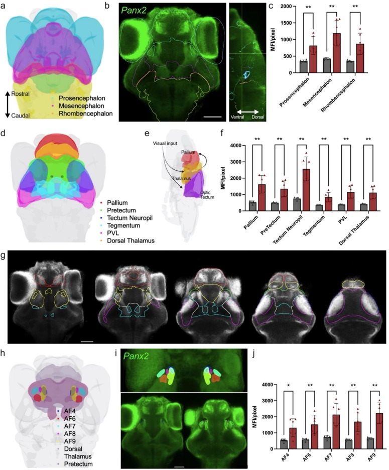 Fig. 1 Panx2 mRNA is expressed broadly in the brain of zebrafish larvae. Spatial distribution of panx2 mRNA was determined by fluorescence in-situ hybridization. a) Three-brain region atlas derived from Kunst et al. [20] showing the major brain subdivisions: prosencephalon, mesencephalon, and rhombencephalon. b) Dorsal view of TL larvae expressing panx2 (green). Scale bar: 50 μm. c) Median fluorescence intensity (MFI) for regions described in (a), panx2 probe (red), control (same procedure without probe, grey). d) Three-dimensional view of larval zebrafish brain regions involved in the visual ascending pathway, acquired from mapZebrain. Regions outlined: pallium (red), pretectum (green), tectum neuropil (blue), tegmentum (cyan), periventricular layer (magenta) and dorsal thalamus (yellow). e) Simplified schematic of the visual processing pathway; visual input travels to the thalamus and optic tectum, subsequently projecting to the pallium. f) MFI for regions described in (d). g) Images from left to right represent sequential slices of panx2-labelled larval brain regions involved in the ascending visual pathway: axial views, ventral to dorsal. h) Three-dimensional view of larval zebrafish brain regions showing retinal arborization fields (AFs) 4, 6, 7, 8 and 9 that partially project within the dorsal thalamus and pretectum. Regions shown as: AF4 (blue), AF6 (red), AF7 (cyan), AF8 (magenta), AF9 (yellow), dorsal thalamus (purple) and pretectum (grey). i) Three-dimensional projection showing AFs mentioned in (h) (top panel). Images of panx2 expression within selected AF regions (bottom panel). j) MFI for regions described in (h). Scale bar: 50 μm. Statistical significance determined with a Welch's test. Significance: ****P-value<0.0001, ***P-value<0.001, P-value<0.01 and *P-value<0.05. Error bars = SD. Sample sizes for TL labelled with panx2 probe, n = 6; control probe, n = 5. See also Supplementary Figs. 1–3 and Supplementary Table 1.