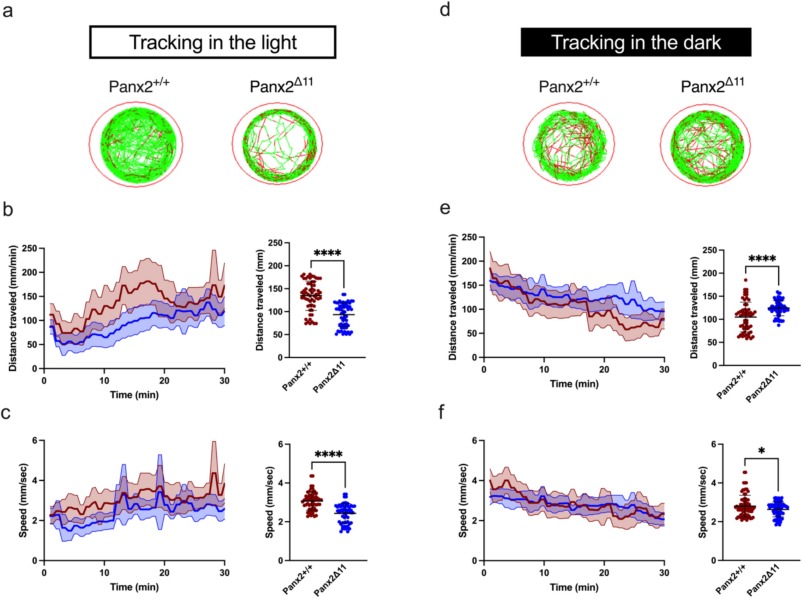 Fig. 5 Light-ON and light-OFF conditions affect free swimming of Panx2Δ11 larvae. Representative images of a single-well showing examples of Panx2+/+ and Panx2Δ11 larvae locomotion patterns in the light (a). Medium (<20 mm/s) or high-speed movements (>20 mm/s) are visualized with green and red colors, respectively. Graphs demonstrate mean experimental traces ±95 % CI of distance traveled (mm) and speed (mm/s) of 6 dpf larvae for 30 min (b,c) and their corresponding mean values, in the light. d) Representative images for each genotype, in the dark. Tracked experimental traces of distance and speed under dark conditions (e,f) and their corresponding mean ± SD. Sample sizes were n = 24 larvae for each genotype. A Welch's t-test was used for statistical comparison between groups. Significance: ****P-value<0.0001 and *P-value<0.05. Error bars = SD. (For interpretation of the references to colour in this figure legend, the reader is referred to the web version of this article.)