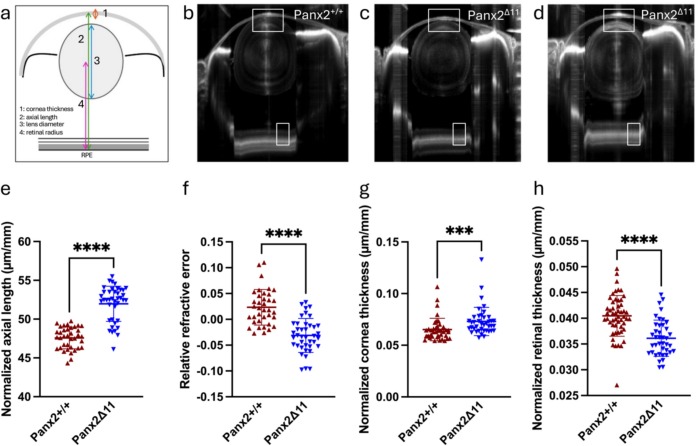 Fig. 8 Panx2 loss leads to lens malformation and decreased retinal thickness in adult zebrafish. Eyes of adult fish were imaged using a SD-OCT system. a) Schematic definition of four geometric parameters used for quantification of high-resolution OCT Whole-eye images. Representative images of Panx2+/+ (b) and Panx2Δ11 (c,d), showing disruptions in lens epithelium. Scale bars = 500 μm. Bar plots showing spread of quantified geometric parameters for the axial length normalized to body length (e), relative refractive error (f), corneal thickness normalized to lens diameter (h), and retinal thickness normalized to lens diameter (h) collectively showing significant differences between the genotypes. Sample sizes for Panx2+/+ and Panx2Δ11 were 38 and 40 eyes from 19 and 20 fish, respectively. Significance: ***P-value <0.001 and ****P-value <0.0001. See also Supplementary Table 7.
