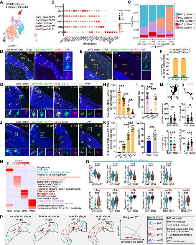 Fig. 2 Temporal microglial heterogeneity under the physiological condition (A) UMAP plot showing re-clustering of microglia/macrophages from the uninjured OT across stages. Cells are colored by their identities. (B) Dot plot showing the expression of marker genes of each subtype in (A). (C) Histograms showing the proportion of each subtype in (A) at each stage. (D and E) ccl34b.1 in situ hybridization (red) combined with EGFP immunostaining (green) on the midbrain sections of Tg(mpeg1:EGFP) at the late-larval (17 dpf) (D) and adult (4 mpf) (E) stages. Dashed lines indicate OT boundaries, arrows indicate ccl34b.1+EGFP+ microglia. Boxed areas are shown magnified in the right panels. Scale bars, 50 μm (D1 and D2, E1 and E2) and 5 μm (zoom-in images). Nuclei are visualized by DAPI (blue). (F) Relative ratio of ccl34b.1+ and ccl34b.1− microglia in (D) and (E) (17 dpf, n = 8 sections/3 animals; 4 mpf, n = 13 sections/3 animals). (G and J) In situ hybridization of ctsba (G) and cd74a (J) combined with immunostaining of EGFP (green) and PCNA (white) on the midbrain sections of Tg(ccl34b.1:EGFP) at four stages, respectively. Signals of the probes are shown in red; arrows indicate the ctsba+EGFP+ MG1 (G) and cd74a+EGFP+ MG2 (J). Boxed areas are shown magnified in the bottom panels. Scale bars, 50 μm (G1–G4, J1–J4) and 5 μm (zoom-in images). Nuclei are visualized by DAPI (blue). (H) Percentage of ctsba+EGFP+ MG1 in ccl34b.1+ microglia per OT section at four stages in (G) (11 dpf, n = 9 sections/4 animals; 21 dpf, n = 13 sections/4 animals; 51 dpf, n = 12 sections/3 animals; 90 dpf, n = 15 sections/3 animals). (I) Relative ratio of ctsba+EGFP+ MG1 located in dorsal, central, or ventral region of OT at 21 dpf in (G2) (n = 13 sections/4 animals). (K) Percentage of cd74a+EGFP+ MG2 in ccl34b.1+ microglia per OT section at four stages in (J) (11 dpf, n = 18 sections/6 animals; 21 dpf, n = 13 sections/4 animals; 51 dpf, n = 14 sections/3 animals; 90 dpf, n = 13 sections/3 animals). (L) Relative ratio of cd74a+EGFP+ MG2 located in TeO or PGZ of OT at 90 dpf in (J4) (n = 13 sections/3 animals; mean ± SEM; parametric paired t tests; ∗∗p < 0.01). (M) Representative binary images and quantification showing differences in morphology between MG1 and MG2 (n = 23 MG1/4 animals, n = 35 MG2/3 animals; mean ± SEM; unpaired Student’s t tests; ns, p > 0.05; ∗∗∗p < 0.001). (N) GO enrichment heatmap of differentially expressed genes (DEGs) across ccl34b.1+ microglial subtypes, color coded by subtype-specific representative GO terms. (O) Violin plots showing the expression levels of lysosome-associated genes and complement system-associated genes in MG1 and MG2 (each dot represents a cell; mean ± SEM; unpaired Student’s t tests; ∗∗∗p < 0.001). (P) Schematic summary showing the temporal heterogeneity of tectal ccl34b.1+ microglial subtypes across stages. In (H), (I), and (K), data are mean ± SEM; statistical significance was determined by one-way ANOVA followed by Tukey’s HSD test (ns, p > 0.05; ∗∗p < 0.01; ∗∗∗p < 0.001).