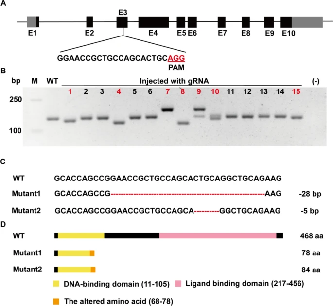 Fig. 2 Construction of zebrafish roraa−/− mutant lines via the CRISPR/Cas9 technique. A Schematic diagram of the roraa exons and target site design. The black boxes represent exons, and the gray boxes represent UTR sequences. The gRNA was designed for the third exon, with the red area indicating the PAM site. B Evaluation of mutation efficiency in embryos after gRNA injection. Twenty-four hours postinjection, the injected embryos were compared with noninjected WT embryos for activity assessment, followed by TA cloning and random selection of colonies for PCR. The results from the 4% agarose gel electrophoresis clearly differed between the experimental group colonies and the WT group (with the corresponding colony numbers marked in red). C Comparison of DNA sequencing results between the WT and mutant strains. The mutation types in the mutants included − 28 bp and − 5 bp. D Comparison of amino acid sequences between the WT and mutant strains. The base deletion led to a frameshift mutation and an early stop codon, resulting in a truncated protein, with the mutant losing part of the DNA-binding domain and the entire ligand-binding domain