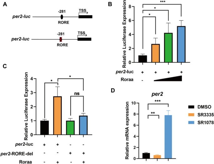 Fig. 4 Transcriptional regulation of the clock gene per2 by Roraa in zebrafish. A Analysis of the cloned promoter sequence elements on the per2-luc plasmid, with a sequence length of 595 bp that includes one RORE element. A schematic diagram showing the deletion of the RORE in the per2 promoter sequence. B The gradient activation effect of Roraa on per2 expression, with activation increasing with increasing concentrations of Roraa at 100 ng, 200 ng, and 400 ng. C The activation effect of Roraa on per2 disappeared after the deletion of the RORE element, indicating the key role of the RORE element in Roraa's regulation of per2 expression. D Comparison of the relative expression levels of per2 in zebrafish treated with SR3335 and SR1078. “ + ” indicates cells transfected with the specific plasmid, whereas “-” indicates the control group without plasmid transfection. The method for difference analysis was Student's t test; ns indicates p > 0.05, * indicates p < 0.05, and *** indicates p < 0.001