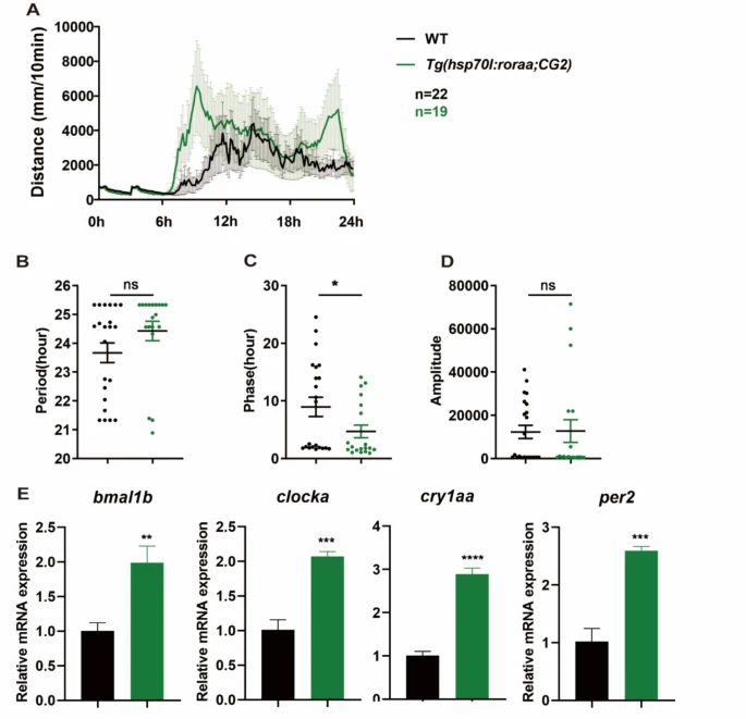 Fig. 5 Whole-body overexpression of roraa disrupts the behavioral rhythms of zebrafish. A Activity change curves for WT and Tg(hsp70 l;CG2) after heat shock at 37 °C. B–D Analysis results of the period, phase, and amplitude. The R package MetaCycle was used for rhythmic analysis of the behavior data, and there were no significant differences in the activity period between WT and roraa−/−; however, the activity phase of roraa−/− zebrafish was advanced by approximately 5 h, and the activity amplitude was significantly lower than that of WT zebrafish. E Changes in the expression of the core clock genes bmal1b, clock1a, cry1aa, and per2 in WT and Tg(hsp70 l;CG2) after heat shock at 37 °C. The black curve represents activity changes in WT, whereas the green curve represents activity changes in Tg(hsp70 l;CG2). The method for difference analysis was Student's t test; ns indicates p > 0.05, * indicates p < 0.05