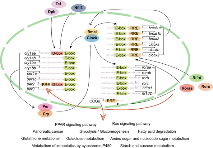 Fig. 8 Model illustrating the regulatory role of Roraa in circadian rhythms and metabolism. This diagram depicts the interactions between the core circadian clock components (Bmal1 and Clock) and various downstream genes, including roraa, as well as their influence on metabolic pathways. Key regulatory elements, such as E-boxes, D-boxes, and ROREs, are highlighted, indicating their involvement in the transcriptional regulation of target genes. Roraa has been shown to directly influence the expression of per2 via the RORE, linking circadian control to metabolic processes. Additionally, the pathways affected by Roraa, including the PPAR signaling pathway and Ras signaling pathway, are illustrated, emphasizing its role in lipid metabolism and overall metabolic homeostasis
