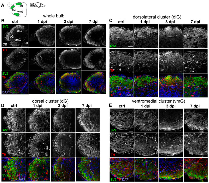 Dysregulation of synaptic contacts in the OB caused by 6-OHDA. (A) Schematic diagram of a sagittal view of the OB, indicating three glomerular clusters: dorsal (dG), dorsolateral (dlG), and ventromedial (vmG). (B–E) Double immunohistochemistry of synaptic vesicle protein 2 (SV2) and tyrosine hydroxylase (TH) in sagittal sections of the OB from controls, 1 dpi, 3 dpi, and 7 dpi groups. Representative images taken from 5–7 animals analyzed per group. Dotted lines indicate the glomerular clusters selected. Whole bulb (B), and magnified views of: (C) dlG cluster, (D) dG cluster, and (E) vmG cluster. Green: Tbr2a; red: TH; blue: DAPI. Scale bars: 100 µm in (B); 50 µm in (C–E).