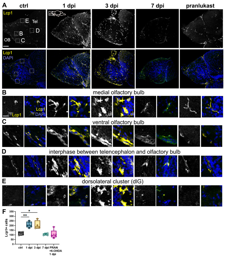 Microglial activation and leukocyte migration in the OB following 6-OHDA injection. (A–E) Lymphocyte cytosolic protein 1 (Lcp1) immunohistochemistry in sagittal sections of the OB from controls, 1 dpi, 3 dpi, 7 dpi, and 6-OHDA with the anti-inflammatory drug pranlukast (PRAN). Whole bulb (A) and magnified views of: (B) middle region of the OB, (C) dlG cluster region, (D) ventral region, and (E) the interphase between the telencephalon and the OB. Yellow: Lcp1; blue: DAPI. Scale bars: 100 µm in (A); 20 µm in (B–E). (F) Quantification of Lcp1+ cells in OB sections from (A) (n = 4–5). ANOVA: F (4, 17) = 10.66, p = 0.0002. ctrl vs. 1 dpi p = 0.0074, ctrl vs. 3 dpi p = 0.0151, ctrl vs. 7 dpi p = 0.0028, 1 dpi vs. 7 dpi p = 0.0028, 1 dpi vs. PRAN p = 0.0019, 3 dpi vs. 7 dpi p = 0.0061, 3 dpi vs. PRAN p = 0.0046. Box plots indicate mean (+), quartiles (boxes) and range (whiskers). One-way ANOVA, * p < 0.005, ** p < 0.001.