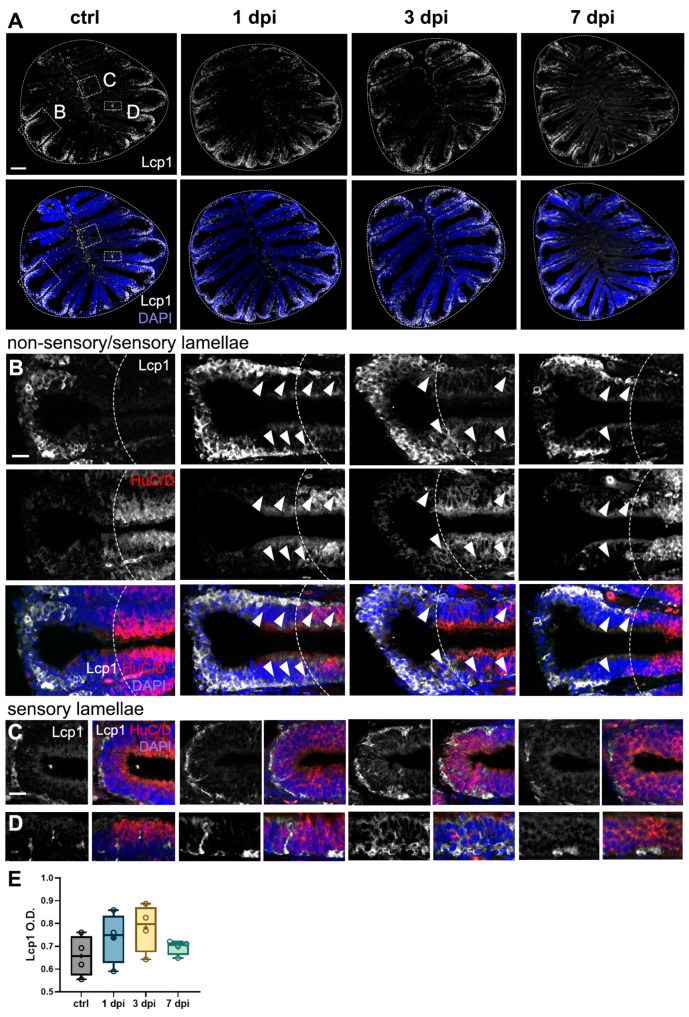 Leukocytic migration within the OE caused by 6-OHDA injections in the OB. (A–D) Lymphocyte cytosolic protein 1 (Lcp1) immunohistochemistry in sections of the OE from controls, 1 dpi, 3 dpi, and 7 dpi. Whole OE (A) and magnified views of the following: (B) distal epithelial fold region, where the OSN-containing sensory region is indicated by HuC/D staining and a dotted line; (C) medial sensory region (HuC/D+) adjacent to the central raphe; and (D) sensory epithelium (HuC/D+). Migration of Lcp1+ cells is indicated by white arrowheads. White: Lcp1; blue: DAPI. Scale bars: 100 µm in (A); 20 µm in (B–D). (E) Quantification of Lcp1+ cells in OE sections from (A) (n = 4). ANOVA: F (3, 12) = 1.42, p = 0.2840. Box plots indicate mean (+), quartiles (boxes), and range (whiskers).
