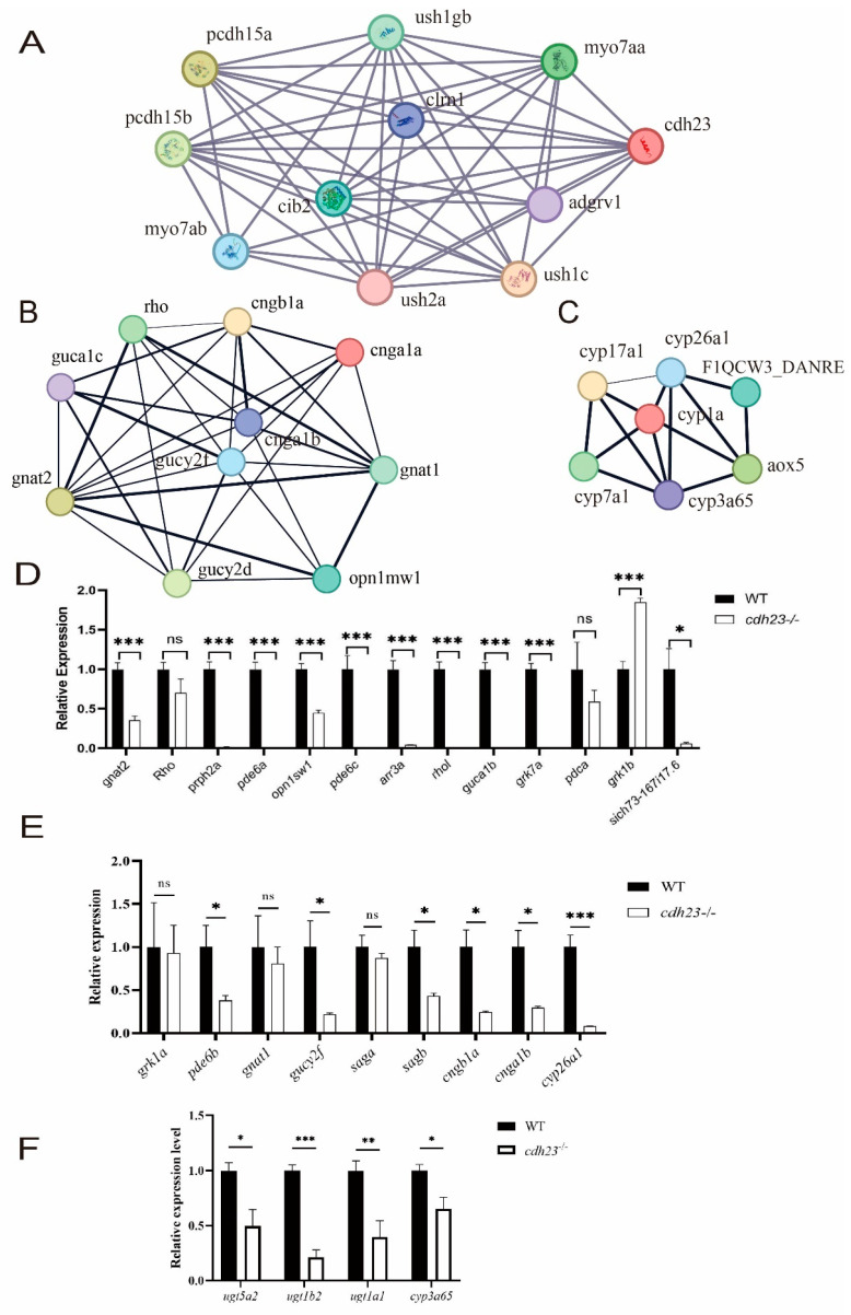 Visualization of network construction analysis of specific pathways. (A) PPI network representing cdh23 gene shows proteins as nodes in graph, with their interactions depicted by lines connecting them. Various colored lines indicate different types of interactions, with thicker lines representing stronger interactions. (B,C) Key genes involved in optical conduction and retinol metabolism, as well as their interactions. (D,E) Gene expression analysis of light sensor degeneration-related genes using RT-qPCR. Additionally, statistical significance was determined with * representing a p value of <0.05, ** representing a p value of <0.01, and *** representing a p value of <0.001. (F) RT-qPCR expression analysis of genes related to retinol metabolism pathway was conducted. The results showed significant differences in gene expression levels (*: p value < 0.05; **: p value < 0.01; ***: p value < 0.001), indicating potential regulatory roles of these pathways in studied biological processes. ns: not significant.