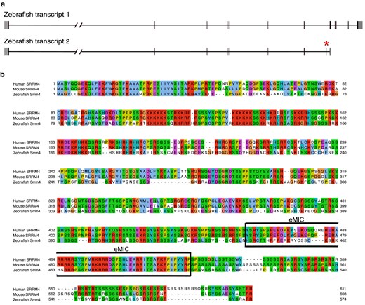 Fig. 1 Zebrafish srrm4 has 2 annotated transcript variants and encodes a protein with a conserved eMIC domain. a) srrm4 transcript variants. Transcript variant 1 (NM_001423807.1) encodes the longer isoform of the Srrm4 protein, which contains the eMIC domain. Transcript variant 2 (XM_021476416.1) has a 16 nt microexon near the 3′ end that creates a frame-shift, resulting in a truncated protein lacking the eMIC domain. The asterisk indicates microexon. Gray shading indicates untranslated regions. b) Sequence alignment of longest isoforms of human, mouse, and zebrafish SRRM4/Srrm4 proteins. The black box outlines the conserved eMIC domain.
