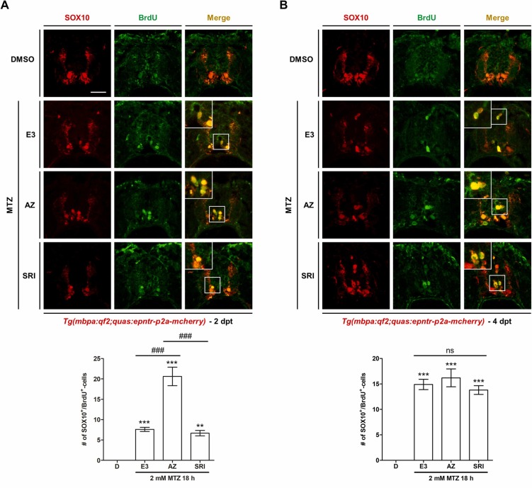 Fig. 7 TGF-βRI kinase inhibitor promotes oligodendrocyte progenitor cell proliferation early after demyelination. Confocal images of a transverse section of the spinal cord of demyelinated zebrafish larvae at 2 and 4 days post-treatment (dpt). Sections are labeled for SOX10 and BrdU; the enlarged images show SOX10+BrdU+-cells. The graphs show the number of BrdU+-cells among the SOX10+-cells 2 and 4 dpt; the double-positive cells are counted in 10 sections per larva. The experiment was repeated thrice. The data are presented as the mean ± SD; n ≥ 8 independent experiments. P-values were calculated using one-way ANOVA followed by Tukey’s test. Significance is indicated by **P < 0.01 and ***P < 0.001 vs. DMSO; ###P < 0.001 vs. MTZ 18 h + E3 or MTZ 18 h + AZ. ns: not significant. Scale bar: 20 μm.