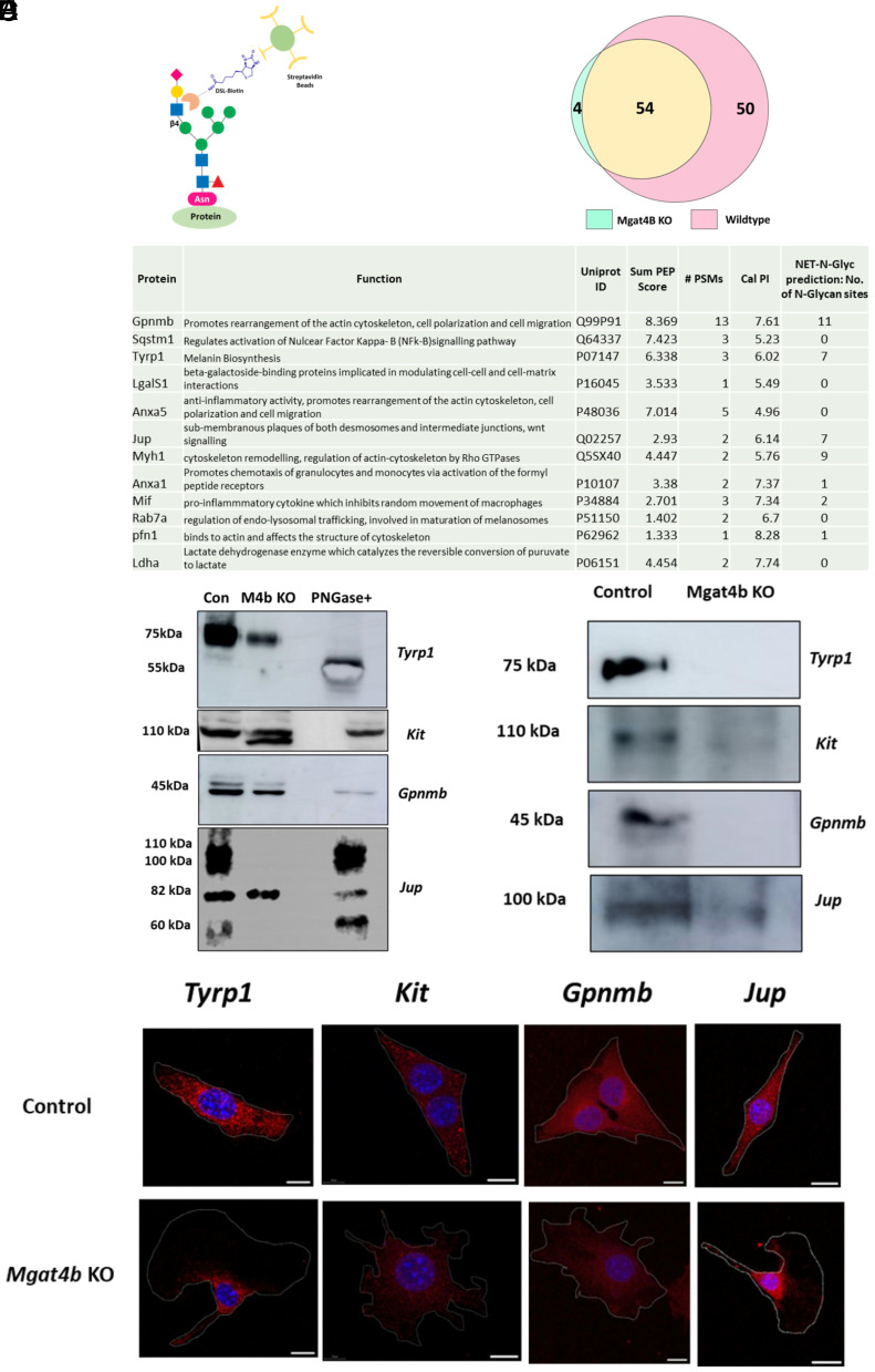 Differential proteomics reveal melanocyte specific target proteins of MGAT4B. (A, B) Schematic overview of the experimental strategy used to identify downstream targets of MGAT4B in melanocytes, Venn diagram depicting number of proteins identified by mass spectrometry analysis of the DSL-enriched fractions of Wildtype and Mgat4b KO proteins. (C) List of differentially enriched proteins in wildtype lysates with respect to Mgat4b KO along with their Uniprot ID, Sum PEP Score, PSMs, calc. PI and their functional profiling and predicted N-glycosylation sites by NetNGlyc—1.0 database. (D) Western blot analysis of Tyrp1, Kit, Gpnmb, and Jup in wildtype and Mgat4b knockout (M4b KO) lysate along with PNGase treated wildtype lysate. (E) Western blot analysis of Tyrp1, c-Kit, Gpnmb, and Jup following biotinylated DSL pull-down in wildtype and Mgat4b knockout (M4b KO) lysates. (F) Confocal microscopy images of immunocytochemistry using Tyrp1, Kit, Gpnmb, and Jup (red) on permeabilized wildtype and Mgat4b KO cells, counterstained by DAPI (blue). The overlay of both channels is depicted. [Scale bar, 50 µm (DSL- Datura stramonium Lectin].