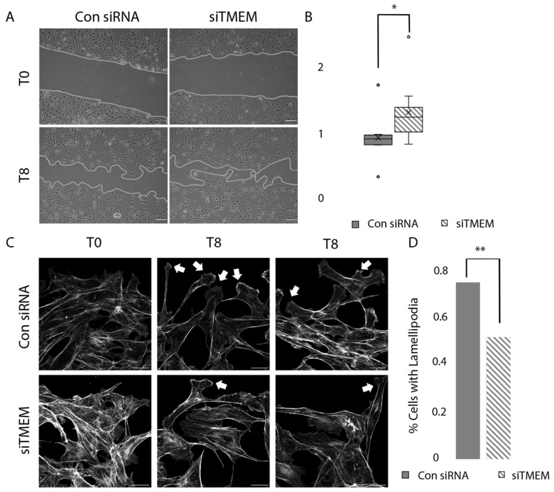 Rate of closure in siTMEM and siRNA cells. (A) Phase contrast (10×) images of transiently transfected BAOEC (siTMEM or control siRNA) cells undergoing migration 0 and 8 h post scratch. Seeded on 0.2% porcine gel; conducted in 0.2–0.5% Hi-FBS MEM media, 37 °C, and 5% CO2. The gray line indicates the leading edge of migration. Scale 100 μm. (B) Rate of closure per well (siTMEM n = 11, control siRNA n = 10) was calculated and normalized to average rate of closure for siRNA per replicate (N = 3). A Mann–Whitney U test was performed, * p < 0.05. (U = 21, p = 0.016). (C) Confocal microscopy of the leading edge at 0 and 8 h post scratch (Gray: Phalloidin) (scale 20 μm). White arrows indicate lamellipodia during cell migrating at the leading edge at T8. (D) Percentage of migratory front cells containing lamellipodia (KD n = 125, control siRNA n = 132 cells). A chi-squared test was performed ** p < 0.001.