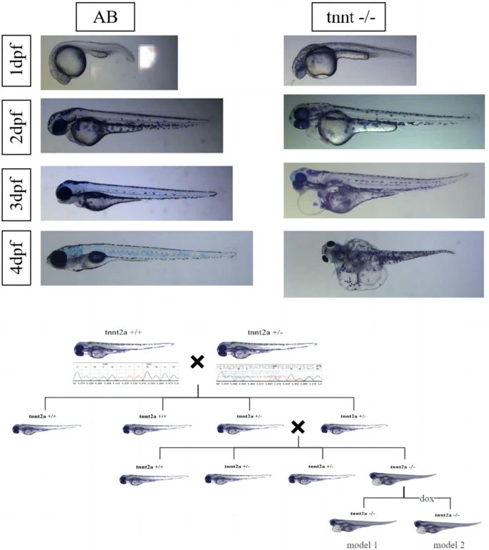 Fig. 1 Acquisition and phenotypic analysis of tnnt2a−/− zebrafish. A Model 1 is the tnnt2a−/− homozygous juveniles produced by self-crossing of tnnt2a heterozygotes. Nevertheless, the homozygous mutant model used in this study has only a 25% probability of being obtained through self-crossing, and it exhibits a high mortality rate. To address these limitations, we employed the Tg:Tnnt2a−/− transgenic zebrafish model (referred to as Model 2) in our study. This model features a recovered heartbeat after the addition of DOX, allowing for more reliable and sustainable experimental conditions. B Representative images of lateral view of AB and tnnt2a−/− zebrafish. At 2 dpf, the tnnt2aex10Δ2 ( tnnt2a−/−) exhibits a phenotype reminiscent of dilated cardiomyopathy, characterized by cardiac arrest and enlargement of both the atrium and ventricle. Concurrently, mutant zebrafish display significant pericardial effusion, a hallmark of heart failure, at approximately 3 dpf