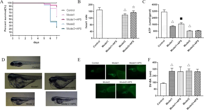 Fig. 3 APS improves the cardiac function of DCM zebrafish. A The survival rates of zebrafish in each group, n = 30. B The heart rate of zebrafish after APS administration. Data are mean ± SD ( n = 10; △P < 0.01, compared with control; ☆P < 0.01, compared with the model 2). C Effects of APS on the ATP of zebrafish in model groups. ( n = 10; △P < 0.01, compared with control; ■P < 0.05, compared with model 1). D Representative images of zebrafish in each group at 4dpf. E–F. Comparison of SV-BA of zebrafish in model groups and after APS treatment. Data are mean ± SD ( n = 8; △P < 0.01, compared with control). The experiment was repeated three times